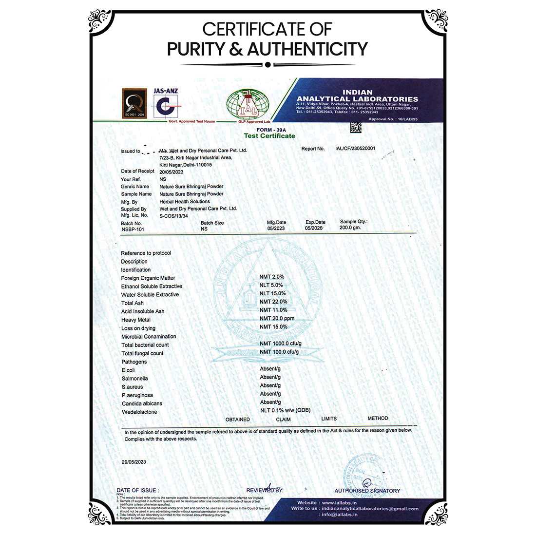 Nature Sure Bhringraj Powder is a traditional remedy for hair care sourced directly from farms. Popularly called Keshraj, or the ruler of hair, it is a time-tested natural hair vitalizer that has been used traditionally for thick and voluminous tresses. This top certified quality product does not contain any chemicals, preservatives, additives or colors. It has been processed and packed at an ISO and GMP certified unit. Its purity and authenticity have been certified by a GLP-approved laboratory.