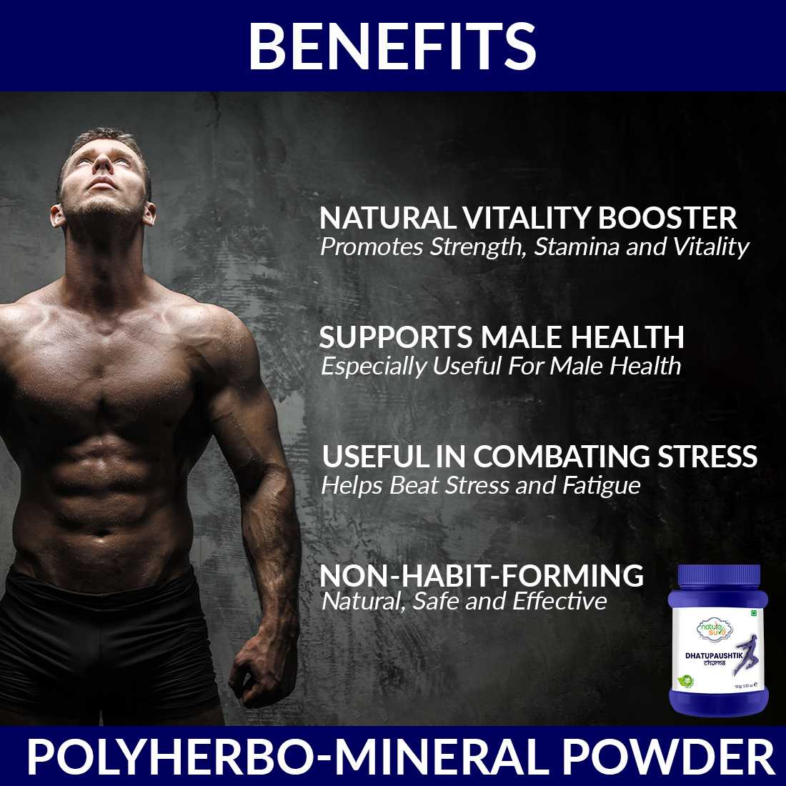 Nature Sure Dhatupaushtik Churna is a premium Ayurvedic formulation made from pure and top-grade herbal, botanical and mineral ingredients that have balya, vrishya and rasayana properties. In Ayurveda, the word ‘dhatu’ refers to tissue and the word ‘paushtik’ means nourishing. Daily use of Nature Sure Dhatupaushtik Churna helps boost strength, stamina and vitality naturally. It also helps enhance immune support. This natural vedic healing powder is especially beneficial in promoting male virility and can also be taken by women.