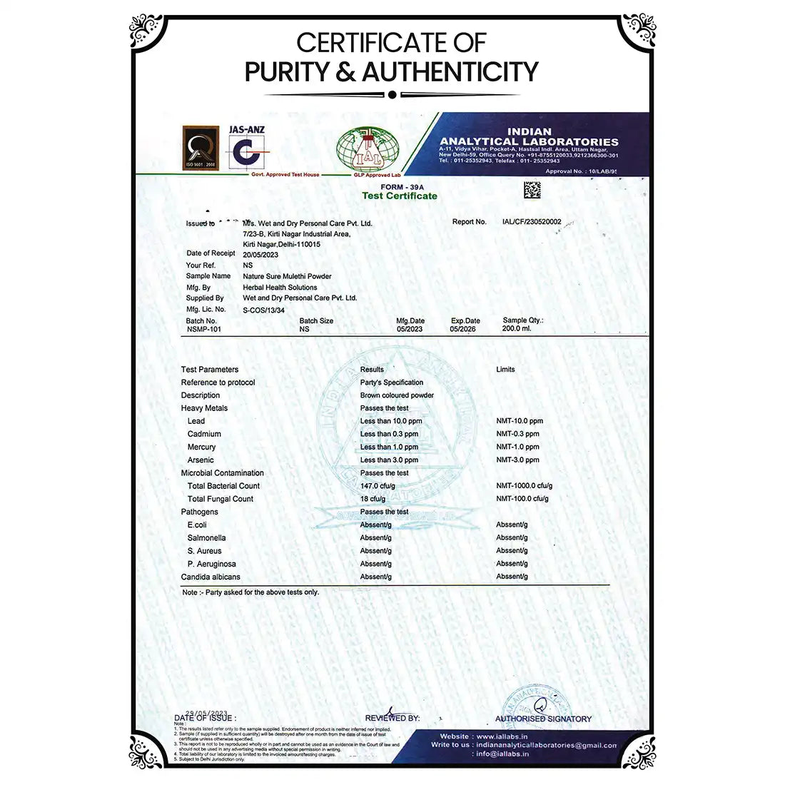 Nature Sure Mulethi Powder is a pure plant-based product that is sourced directly from farms. This top certified quality product is non-GMO and does not contain any chemicals, preservatives, additives or colors. It has been processed and packed at an ISO and GMP certified unit. Its purity and authenticity have been certified by a GLP-approved laboratory.