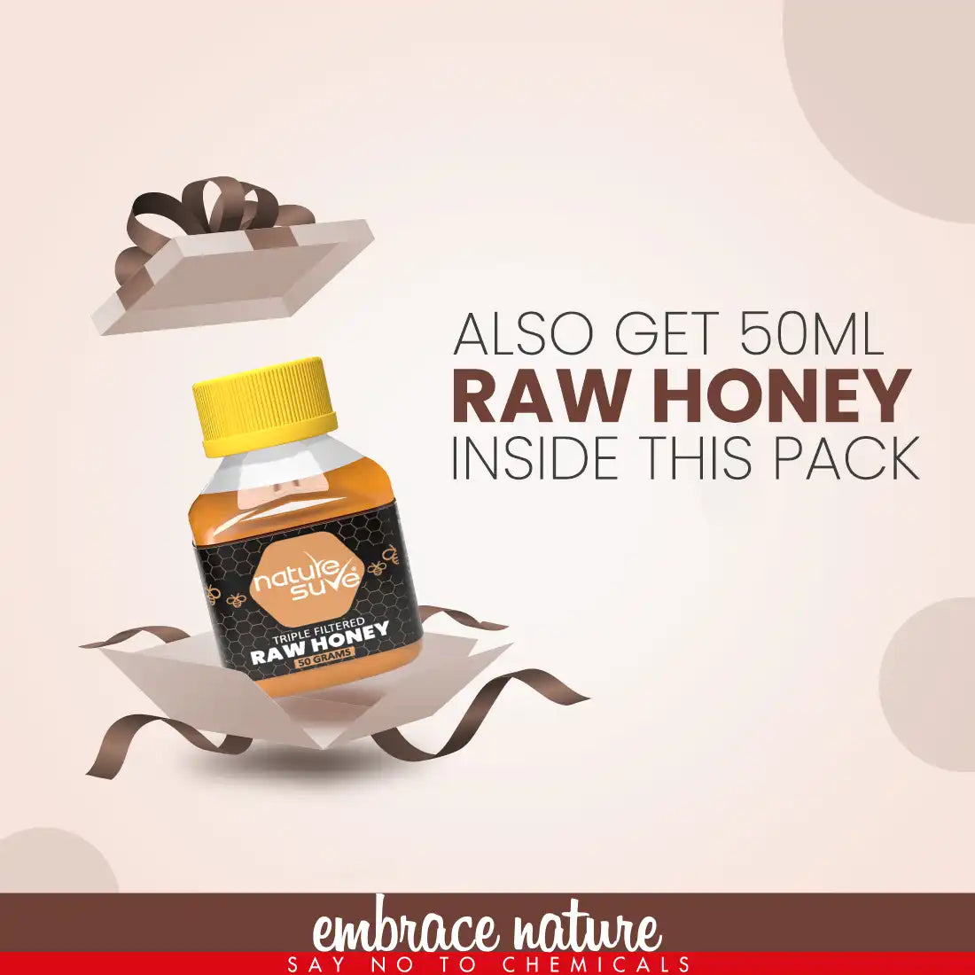 When you buy this pack of Nature Sure Triphala Powder 100 grams, you also get 50g raw honey, one measuring spoon, and a how-to-use recipe leaflet inside the pack.